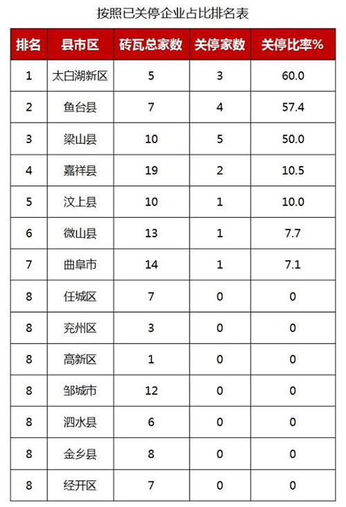目前,濟(jì)寧市磚瓦企業(yè)整合重組工作穩(wěn)步推進(jìn),122家磚瓦企業(yè)中,17家企業(yè)已關(guān)停,包括曲阜1家,魚(yú)臺(tái)4家,梁山5家,汶上1家,太白湖3家,嘉祥2家,微山1家;105家企業(yè)處于前期,其中任城7家,兗州3家,高新1家,曲阜13家,鄒城12家,泗水6家,微山12家,魚(yú)臺(tái)3家,金鄉(xiāng)8家,嘉祥17家,汶上9家,梁山5家,太白湖2家,經(jīng)開(kāi)區(qū)7家;按照已關(guān)停企業(yè)占比進(jìn)行排名,排在前三名的縣市區(qū)為太白湖新區(qū)、魚(yú)臺(tái)縣、梁山縣,關(guān)停占比分別為60.0%、57.4%、50.0%。