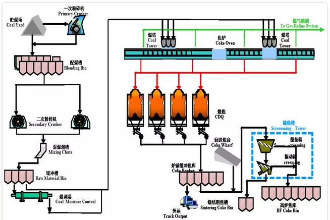 煉焦的目的是生產(chǎn)質(zhì)優(yōu)、價(jià)廉的冶金焦炭。煉焦同時(shí)還能產(chǎn)生焦?fàn)t煤氣還能作為燃料。煉焦生產(chǎn)單元一般包括配煤、煤處理、焦?fàn)t燃燒、焦?fàn)t出爐、熄焦、焦處理等工序。主要原料有:煉焦煤、軟瀝青等。大致工藝流程如下: