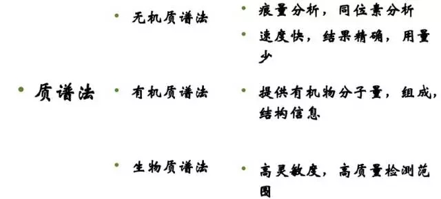 質(zhì)譜: 分析分子、原子、或原子團(tuán)的質(zhì)量的,可以推測(cè)物質(zhì)的組成,一般用于定性分析較多,也可定量。