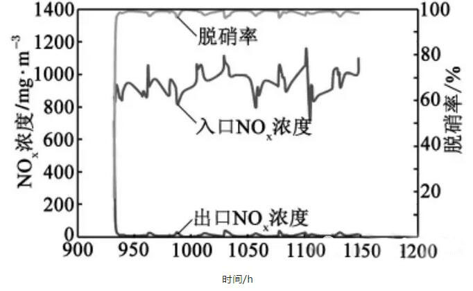 使用該類(lèi)型的催化劑即使在入口NOx濃度很高時(shí)(2000~3000mg/m3),也可達(dá)到很高的NOx脫除精度,反應(yīng)后尾氣中氮氧化物濃度可低于150 mg/m3。如排放標(biāo)準(zhǔn)進(jìn)一步升級(jí),不需對(duì)催化劑和反應(yīng)裝置做任何改動(dòng),只需稍微增加氨投入量,提供反應(yīng)所需的氨量,即可使尾氣中NOx濃度小于所規(guī)定的排放限值。