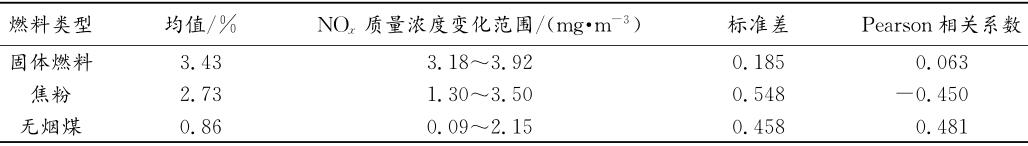 因此,在探討固體燃料類型對(duì)NOx排放的影響規(guī)律時(shí),將固體燃料比例固定,研究焦粉和無煙煤的比例變化對(duì)煙氣NOx排放的影響規(guī)律。根據(jù)固體燃料比例樣本數(shù)據(jù)的分布規(guī)律,選取具有代表性的固體燃料比例為3.3%~3.5%的樣本數(shù)據(jù)進(jìn)行相關(guān)性分析研究,結(jié)果見表3。