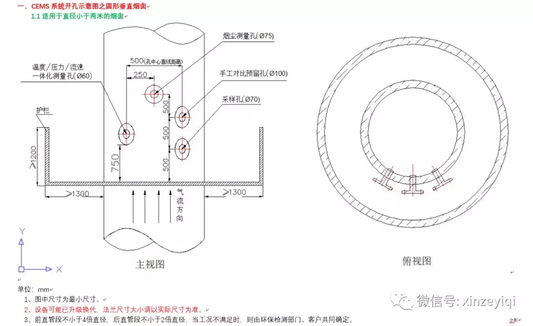 一、 煙氣在線監(jiān)測設(shè)備開孔示意圖之圓形垂直煙囪